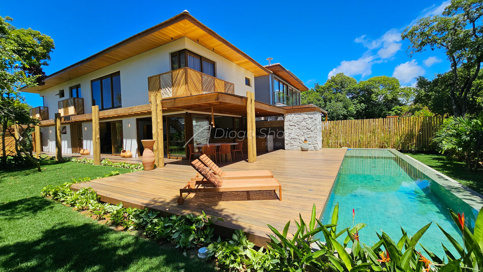Casa de luxo com 5 suítes. Localizada no condomínio Praia Bella, na Praia do Forte - BA, esta casa une o rústico ao moderno, com a utilização de materiais nobres e naturais, como o eucalipto, cumaru, jatobá, acabamentos em biribas, além do cimento queimado e diversos recursos de automação.