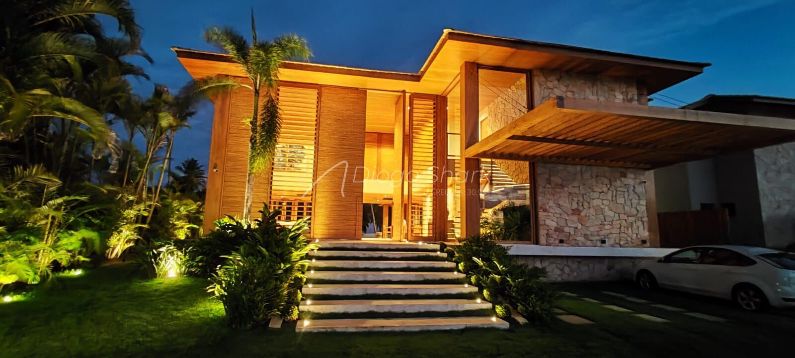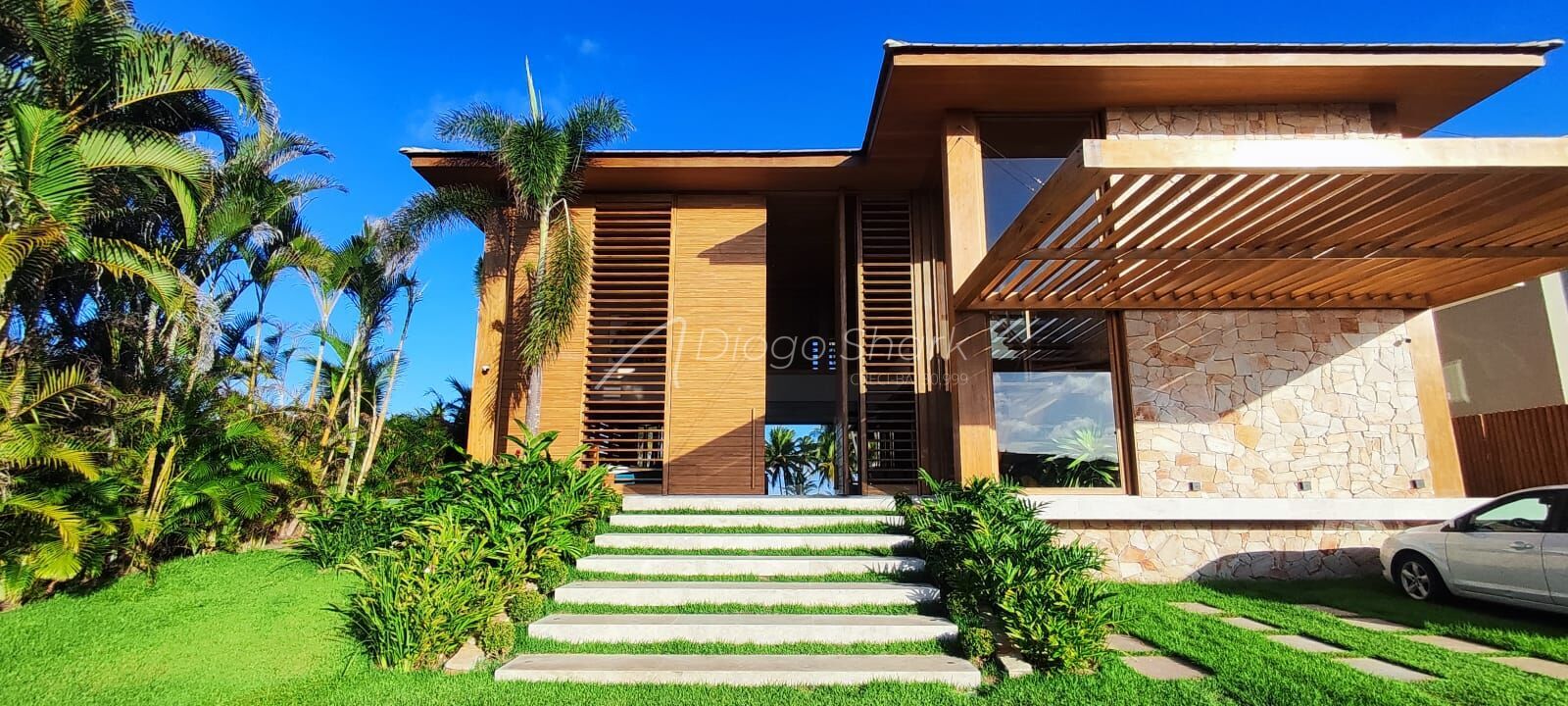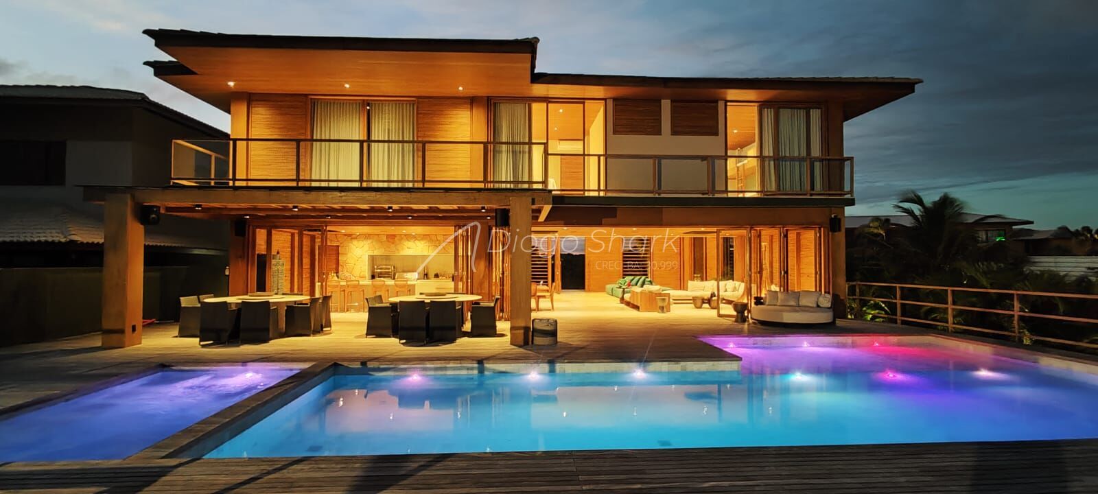 Com projeto da arquiteta Lais Galvão, casa frente mar, construída com madeira Demuner, composta de 6 suítes, sendo 5 com cama de casal e 1 com bicama de 6 lugares para criança. Piscina de 3 níveis, iluminada e com hidro, varanda gourmet com churrasqueira elétrica, cervejeira, adega, telão, ampla sala de estar, jantar, cozinha, dispensa, 2 dependências completas com uma grande área de serviço e outra cozinha subterrânea para atender eventos e um campinho de futebol .